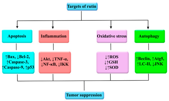 The plant kingdom offers a tremendous source of alternative anticancer drugs. Among natural entities, rutin, a glycosylated flavonoid, possesses several significant biological activities with the prevailing evidence now being focused on its anticancer effects. Rutin has been shown to employ multiple mechanisms to impede cancer initiation and progression by modulating various dysregulated signaling pathways implicated in inflammation, apoptosis, autophagy, and angiogenesis (Figure 4). Specifically, the tumor-inhibitory effects of rutin have been shown to be exerted through the regulation of various signaling pathways, such as PI3K/Akt/mTOR, NF-κB, Nrf2, ERK, p38 MAPK, and JNK. This bioactive natural agent potentially interferes with several intracellular signaling molecules, including TNF-α, ILs, LC3/Beclin, Bax, Bcl-2, caspases, and VEGF. In particular, extensive studies have revealed that rutin targets various therapeutically important molecules, such as p53, Bax, Bcl-2, caspase-3, caspase-9, NF-κB, Akt, TNF-α, Atg5, Beclin, GSH, and SOD (Figure 5). Several cancer types, including breast cancer, glioblastoma, prostate cancer, lung adenocarcinoma, gastric cancer, hepatocellular carcinoma, leukemia, and colon cancer, are impacted by rutin. Most of the current anticancer evidence of rutin is focused on in vitro models of cancer, with very limited in vivo studies. Despite various preclinical mechanistic studies on the anticancer effects of rutin, lack of well-designed randomized clinical trials on the therapeutic activities and safety of rutin escalates the need toward more clinical investigations. The possible pharmacokinetic limitations of rutin underscore the need for developing appropriate delivery systems. Additional studies and engineering methods are required to design surface modified nanostructures of rutin to achieve targeted drug delivery systems against cancer. A further area of research on novel molecular targets and signaling pathways of rutin, as well as providing well-controlled clinical trials, will develop its clinical applications in the prevention and treatment of several cancer types.