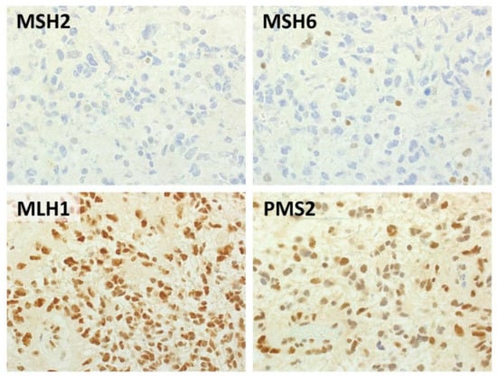 - McCord, M.; Steffens, A.; Javier, R.; Kam, K.-L.; McCortney, K.; Horbinski, C. The efficacy of DNA mismatch repair enzyme immunohistochemistry as a screening test for hypermutated gliomas. Acta Neuropathol. Commun. 2020, 8, 15. [Google Scholar] [CrossRef]