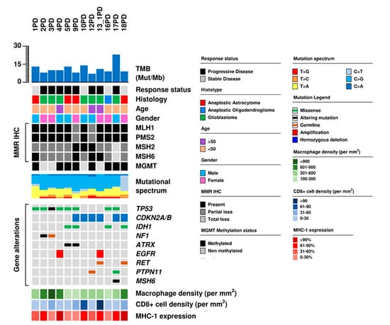 - Hodges, T.R.; Ott, M.; Xiu, J.; Gatalica, Z.; Swensen, J.; Zhou, S.; Huse, J.T.; de Groot, J.; Li, S.; Overwijk, W.W.; et al. Mutational burden, immune checkpoint expression, and mismatch repair in glioma: Implications for immune checkpoint immunotherapy. Neuro Oncol. 2017, 19, 1047–1057. [Google Scholar] [CrossRef] [PubMed]