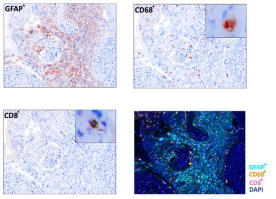 - Pinton, L.; Masetto, E.; Vettore, M.; Solito, S.; Magri, S.; D’Andolfi, M.; Del Bianco, P.; Lollo, G.; Benoit, J.P.; Okada, H.; et al. The immune suppressive microenvironment of human gliomas depends on the accumulation of bone marrow-derived macrophages in the center of the lesion. J. Immunother. Cancer 2019, 7, 1–14. [Google Scholar] [CrossRef] [PubMed]