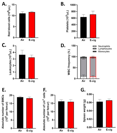 Two-month E-cigarette exposure does not affect peripheral blood cell counts of (A) red blood cells, (B) platelets, (C) leukocytes, and (D) leukocyte differentials in C57Bl/6J mice. (E) Bone marrow cellularity, (F) lineage positive cells, and (G) spleen weight after E-cigarette exposure in air and E-cigarette exposed mice. Data are shown as mean ± SEM, n = 4–7 mice/group. WBC, white blood cell; BMCs, bone marrow cells; Lin+, lineage positive.