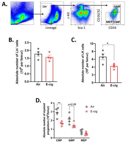 E-cigarette exposure suppresses myeloid progenitor cell numbers in the bone marrow. (A) Gating scheme for the characterization of progenitor cell sub-types. Absolute numbers of (B) lineage- (Lin-), (C) lineage-, c-Kit+ (LK) and (D) CMP, GMP and MEP per femur. Data are shown as mean ± SEM, n = 4 mice/group. * p < 0.05, ** p < 0.01, unpaired student’s t-test.