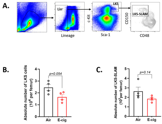 Next, we investigated the impact of E-cigarette exposure on the hematopoietic stem and progenitor compartment (HSPC) using the gating scheme in Figure 3A. E-cigarette exposure decreased the absolute number of HSPCs (p = 0.05), defined as lineage negative, c-Kit positive and Sca-1 positive (LKS; Lin− c-kit+ Sca-1+) surface marker phenotype (Figure 3B). In addition, there was a trend toward decreased long-term repopulating hematopoietic stem cells (LT-HSCs), defined as (LKS-SLAM; LKS-CD48− CD150+), but failed to reach significance (p = 0.14) (Figure 3C). This observed decrease in absolute number of LKS cells, which contains LT-HSCs, short-term HSCs (ST-HSCs) and multipotent progenitors (MPPs) as well as downstream myeloid committed progenitors, suggests that E-cigarette exposure leads to dysregulation of bone marrow hematopoiesis.