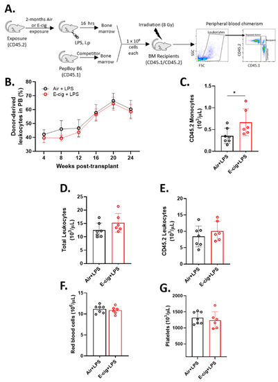 Systemic LPS post-E-cigarette exposure results in persistent monocytosis. (A) Experimental design. (B) Peripheral blood chimerism of CD45.2 leukocytes from air and E-cigarette exposed donor cells. Peripheral blood counts of (C) CD45.2 monocytes, (D) leukocytes, (E) CD45.2 leukocytes, (F) red blood cells, and (G) platelets 20 weeks post-transplant. Data are shown as mean ± SEM. n = 5–6 mice/group. * p < 0.05, unpaired student’s t-test.
