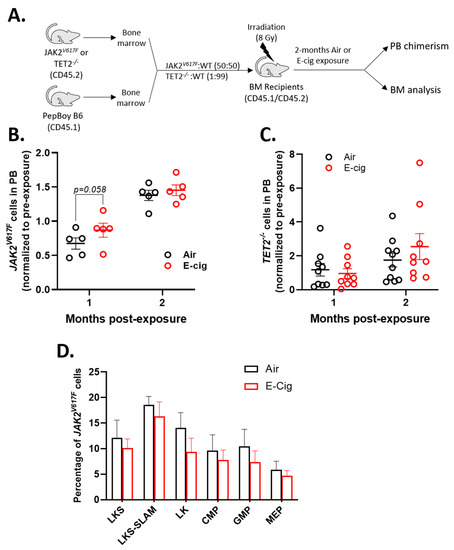 Chronic inflammation is a hallmark feature in myeloproliferative neoplasms (MPNs) and is a driver of disease progression. Data indicates that inflammatory signals such as LPS influence the selective outgrowth and expansion of myeloid leukemia associated somatic mutations such as JAK2V617F and TET2−/− [28,29]. Therefore, we sought to determine whether E-cigarette exposure could promote the selective expansion of mutant cells utilizing competitive transplants of JAK2V617F mutated and TET2 knockout bone marrow cells. (Figure 6A). After one month of E-cigarette exposure, the relative frequency of JAK2V617F cells in the peripheral blood was almost significantly more than the air exposed group (p = 0.058) (Figure 6B). However, at the end of two months of exposure, both air and E-cigarette groups showed similar levels of JAK2V617F cells in the blood (Figure 6B). In contrast, TET2 knockout cells were not affected by E-cigarette exposure compared to the control group (Figure 6C). To determine if E-cigarette exposure selects for mutant cells in the bone marrow, we measured the percentage of JAK2V617F cells in each of the HSPC sub-types at sacrifice. We found no difference between control and E-cigarette exposure in the number of JAK2V617F mutant HSPCs in the bone marrow (Figure 6D).