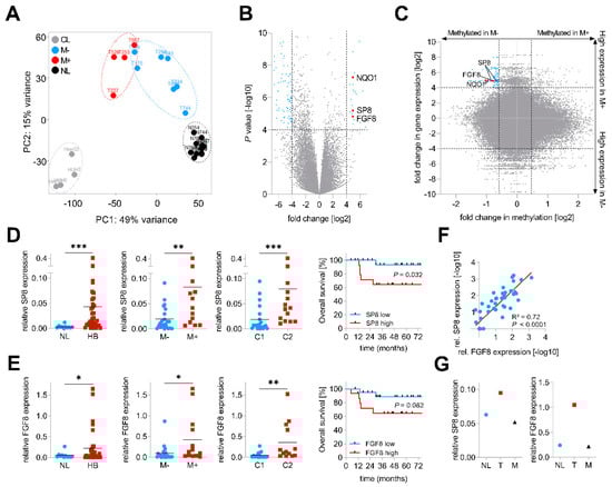 Identification of SP8 as a metastasis-associated marker of hepatoblastoma (HB). (A) principal component analysis of RNA sequencing-based expression data from 11 normal liver samples (NL, depicted in black), 7 non-metastasized (M−, in blue), 4 metastasized (M+, in red) primary tumors and 4 liver tumor cell lines (CL, in grey); (B) volcano plot displaying genes that are differentially expressed between M+ and M− tumors. Each gene is plotted with log2-fold expression change on the x-axis and negative log10 p-value on the y-axis. Genes with an absolute log2-fold change >4 and a p-value < 0.0001 are shown in blue. Candidate genes NQO1, SP8 and FGF8 are highlighted in red; (C) scatterplot with all CpG probes showing the correlation of promoter methylation and RNA expression between the M+ and M− subgroup. Genes with a fold change in methylation ≤ −1.5 and log2-fold expression change ≥4 are indicated in blue. CpG probes associated with SP8, FGF8 and NQO1 are indicated in red. (D) SP8 and (E) FGF8 expression levels were measured by Q-PCR, normalized to the house-keeping gene TBP, and categorized into NL and HB specimens, M− and M+ tumors, and the C1 and C2 subtype of the 16-gene signature [11]. Statistical significance of all experiments was calculated using the Mann–Whitney test (p < 0.05). Overall survival was calculated as time from diagnosis to death of the disease and is plotted for 35 HB patients. Statistical significance was calculated using the Mantel–Cox test; (F) correlation of SP8 and FGF8 expression in 35 tumor and 11 normal liver samples. Dots represent −log10 values of relative SP8 expression plotted versus −log10 values of relative FGF8 expression; (G) SP8 and FGF8 expression measured by Q-PCR and normalized to the house-keeping gene TBP in a patient with surgically removed metastasis (M) and primary tumor (T) with adjacent normal liver (NL). * p < 0.05, ** p < 0.01, *** p < 0.001.