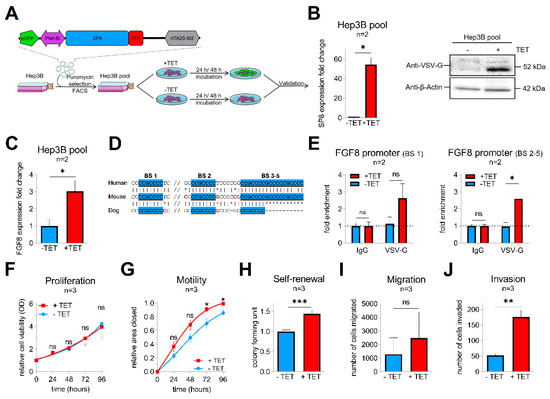 (A) schematic workflow of the validation approach of SP8 function in a Hep3B cell pool stably transfected with a TET-inducible SP8-eGFP-expression vector. Transfected cells were selected by puromycin treatment and enriched by fluorescence-assisted cell sorting (FACS). (B) SP8 overexpression 24 h after TET-induction was recognized by eGFP detection upon fluorescence microscopy (green cells) and proven on the RNA and protein level using Q-PCR and Western blotting, respectively. (C) FGF8 expression levels after stable SP8-induction in Hep3B pool cells for 48 h was measured by Q-PCR (normalized to TBP). (D) schematic overview of the putative SP8 binding sites one to five upstream of the FGF8 promoter predicted from the SP1-binding motif (GGGGCGG or CCGCCCC), highlighted in blue. (E) Chromatin immunoprecipitation was performed with Hep3B pool cells 48 h after TET-induction using an anti-VSV-G antibody or IgG control. Enrichment of VSV-SP8 binding on DNA fragments containing the putative SP8 binding site (BS) 1 (left panel) and BS2-5 (right panel) versus IgG background is plotted. Assays for (F) proliferation, (G) motility, (H) self-renewal, (I) migration and (J) invasion were conducted to validate tumor cell characteristics of TET-induced Hep3B cells. Means ± SEM were calculated from the indicated number of independent experiments. Statistical significance of all experiments was calculated using Mann–Whitney test (*p < 0.05, ** p < 0.01, *** p < 0.001).