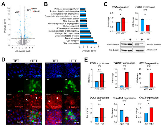 (A) volcano plot displaying genes that are differentially expressed between SP8-induced and non-induced Hep3B pool cells. Each gene is plotted with log2-fold expression change on the x-axis and negative log10 p-value on the y-axis. Genes with an absolute log2-fold change > 1 and a p-value < 0.05 are shown in blue. Candidate genes SP8, SPP1, SPARC, and MCC are highlighted in red; (B) functional annotation of differentially expressed genes between SP8-induced and non-induced Hep3B pool cells with a log2 fold change >1 and a p-value < 0.05; (C) detection of vimentin (VIM) and E-cadherin (CDH1) mRNA (upper part) and protein levels (lower part) in Hep3B pool cells 144 h after TET-induction by means of Q-PCR and Western blotting, respectively. Immunodetection of β-actin was used to standardize for equal protein loading. Representative Western blot images from three independent experiments are given. (D) Immunofluorescent staining (depicted in red) of vimentin (left panel) and E-cadherin (right panel) of Hep3B cells 144 h after TET-induction. Positively transfected cells expressing eGFP are depicted in green. DNA was counter-stained with DAPI (depicted in blue). Scale bar indicates 50 µm. (E) Expression of the EMT markers ZEB1, TWIST1, SPP1, DLK1, CAV2, and the epithelial marker SEMA5A, as determined by Q-PCR. Expression values are normalized to the house-keeping gene TBP and means ± SEM were calculated from the indicated number of independent experiments. Statistical significance of all experiments was calculated using a t-test (*p < 0.05, ** p < 0.01, *** p < 0.001).