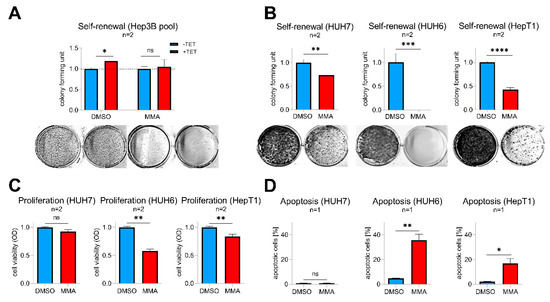 (A) Hep3B pool cells were treated with 10 nM mithramycin A (MMA) or DMSO as a control with (+TET) or without (−TET) SP8-induction. (B–D) HUH7, HUH6, and HepT1 cells were treated with 10 nM (HUH7 and HUH6) or 30 nM (HepT1) MMA or DMSO as a control. (A,B) Self-renewal was determined by counting colonies 10 days after MMA treatment and results normalized to 1. Representative images of cell assays are shown below the graphs. (C) Proliferation and (D) apoptosis assays were conducted 48 h after MMA treatment. Means ± SEM were calculated from the indicated number of independent experiments. Statistical significance of all experiments was calculated using t-test (* p < 0.05, ** p < 0.01, *** p < 0.001, **** p < 0.0001).