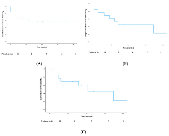 In total, seven patients died. Kaplan–Meier-estimated median OS (overall survival) was 103.9 months (22.1; 185.8); estimated 2- and 5-year OS were 76.9%/69.2%, respectively (Figure 1C). OS was not significantly different in patients with local recurrence (n = 5) compared to patients without local recurrence (n = 8) (p = 0.99).