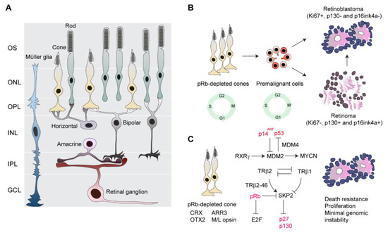 pRb is a cell cycle regulator and centrally important for tumor suppression [57]. pRb interacts physically with two critical mediators, E2F1 and SKP2, to inhibit cell cycle progression, thereby blocking G1-S phase transition [58]. In the normal retina, pRb is widely expressed in developing cells to ensure appropriate cell-cycle exit and terminal differentiation [59,60]. Differentiating cone cells, particularly in the fovea, express high levels of pRb [59]. Depletion of pRb in the developing human retina has shown that only post-mitotic cones re-enter the cell cycle and become apoptosis resistant and proliferative [17,26] (Figure 1). In contrast, progenitors and Müller glia undergo apoptotic death, while other cells, such as retinal ganglion cells, rod cells, horizontal and amacrine interneurons, and bipolar cells, remain in the post-mitotic state [26] (Figure 1A). Furthermore, pRb-depleted human cone cells that express medium/long-wave-sensitive (M/L) opsin and cone arrestin (ARR3) form retinoma and retinoblastoma-like lesions. This indicates that maturing cone cells rather than early post-mitotic, immature cone cells (ARR3-negative cells) are oncogenically activated and highlights the importance of developmental state specificity in tumorigenesis [17,26] (Figure 1B,C).