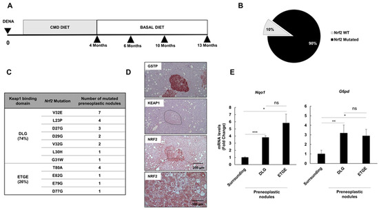 We have previously shown that a single intraperitoneal dose of DENA followed by continuous feeding of a CMD diet for 4 months led to the development of preneoplastic nodules [28] positive for the placental form of glutathione transferase (GSTP), a well-known preneoplastic marker [31]. Nrf2 somatic mutations occurred at a high frequency in GSTP+ preneoplastic lesions, demonstrating that mutation of this transcription factor is a very early event in hepatic tumorigenesis [28]. In the present study, we show that 4 months of CMD feeding following DENA administration resulted in a very high percentage (90%) of GSTP+ preneoplastic lesions carrying Nrf2 somatic mutations (27 out of 30) (Figure 1B). All of them were localized in exon 2 of the Nrf2 gene and confined within the two Keap1 binding domains: DLG (74%) and ETGE (26%) (Figure 1C). Since no interaction between Nrf2 and Keap1 might occur in the presence of these mutations [16], they are considered “bona fide” activating mutations. Activation of this pathway in preneoplastic lesions was indeed confirmed by enhanced Nrf2 NRF2 content and nuclear translocation in GSTP+ nodules (Figure 1D), which was associated with upregulation of Nqo1 and G6pd—two well established Nrf2 target genes [32,33] (Figure 1E). No significant difference in mRNA expression levels of Nqo1 and G6pd was found between nodules carrying mutations in the DLG or in the ETGE domain. No difference in KEAP1 expression between preneoplastic lesions and surrounding liver was detected (Figure 1D).