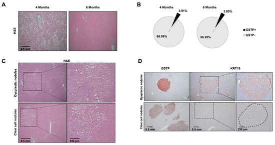 As expected, two months after CMD withdrawal (6 months after DENA treatment), livers no longer showed evidence of the massive fat accumulation observed at 4 months of continuous CMD feeding (Figure 2A). The hepatic area occupied by GSTP+ nodules was roughly similar to that observed before withdrawal (4 months) (Figure 2B). Notably, histological examination revealed the presence of two types of preneoplastic nodules (Figure 2C): clear cell and dysplastic nodules. Clear cell nodules displayed a clear (glycogen-rich) cytoplasm with a normal nuclear–cytoplasmic ratio, whereas dysplastic nodules were characterized by profound cellular alterations and a distorted nuclear–cytoplasmic ratio. Even though both types of nodules were GSTP+, a fraction of dysplastic, but not of clear cell, nodules displayed positivity for the putative stem/progenitor cell marker cytokeratin-19 (KRT-19) [34], suggesting a more aggressive phenotype [35,36] (Figure 2D). It is worth noting that no expression of KRT-19 was found in preneoplastic lesions of rats killed at 4 months, indicating that the acquisition of this marker in the CMD protocol occurs at later stages of the tumorigenic process, as also demonstrated in different rat and mouse hepatocarcinogenesis models [37,38].