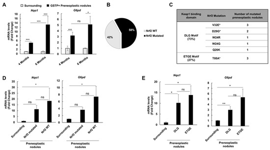 Nrf2 is also activated in the absence of an oxidative environment. (A) Nqo1 (left) and G6pd (right) mRNA expression level in surrounding tissue and microdissected GSTP+ preneoplastic nodules. mRNA expression levels were assessed by qRT-PCR. Relative mRNA expression was calculated by using the 2-∆∆CT method and Gapdh as endogenous control. Gene expression is reported as fold-change relative to respective surrounding tissue. Each bar represents mean ± standard error (SEM) of 5 to 21 samples per group. Student’s t-test was used for the evaluation of statistical significance. * p < 0.05; *** p < 0.001; (B) Pie chart representing the percentage (58%; 11/19 nodules) of Nrf2 mutations in GSTP+ preneoplastic lesions; (C) List of Nrf2 mutations identified in GSTP+ nodules. All mutations are confined within the DLG (73%) or ETGE (27%) motif of exon 2 of the Nrf2 gene. V32E is the only mutation at the weak bond (DLG) for Keap1, whereas T80A is the most frequent mutation in the strong domain for Keap1. Asterisks indicate mutations present at both 4 and 6 months; (D) Nqo1 and G6pd mRNA levels in mutated and non-mutated (WT) preneoplastic nodules 6 months after DENA treatment; (E) Comparison of Nqo1 and G6pd mRNA levels between DLG and ETGE motif mutations. mRNA expression levels were assessed by qRT-PCR. Relative mRNA expression was calculated by using the 2-∆∆CT method and Gapdh as endogenous control. Gene expression is reported as fold-change relative to surrounding tissue. Each bar represents mean ± standard error (SEM) of 4 to 17 samples per group. ANOVA with Tukey post-hoc test was used for the evaluation of statistical significance. *p < 0.05; ** p < 0.01; ns, not significant.