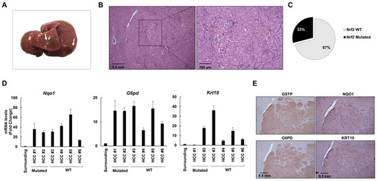 Intriguingly, since activation of the Nrf2-Keap1 pathway, as detected by enhanced expression of Nqo1, G6pd and Krt-19, was found in all examined HCCs, it is independent of the presence of Nrf2 gene mutation (Figure 5D). Positivity of HCC cells for these markers was confirmed by immunohistochemistry (IHC) (Figure 5E).