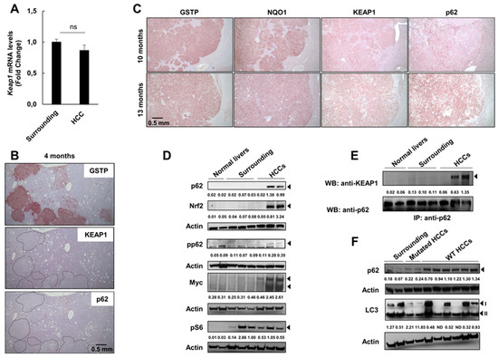 Aberrant accumulation of p62 interferes with the interaction between Nrf2 and its inhibitor Keap1 [44]. The Keap1-interacting region (KIR) of p62 binds to Keap1 in a manner similar to the Nrf2 ETGE motif, thereby preventing Keap1 from trapping Nrf2, thus resulting in Nrf2 stabilization and activation [13,44]. As a consequence, the interaction between p62 and Keap1 contributes to progression to malignancy in an Nrf2-dependent manner [45,46,47]. To investigate the role of p62 in our system, we performed immunostaining on serial sections of preneoplastic nodules and HCCs positive for GSTP. The results showed that while no accumulation of KEAP1 and p62 was observed at early steps of hepatocarcinogenesis, whereby mutations of Nrf2 characterize the vast majority of preneoplastic lesions, a strong accumulation was found in most HCCs (Figure 6B,C and Figure S3A,B). P62 accumulation in HCCs, compared to surrounding and normal liver, was confirmed by western blot (WB) analysis (Figure 6D). Umemura et al. [48] have shown that in addition to activating Nrf2, p62 promotes hepatocarcinogenesis by increasing mTORC1 signaling and regulating c-Myc expression. Our results show that while p62 content positively correlated with an enhanced content of c-myc—a likely indicator of increased proliferation—a clear correlation between p62 and mTORC1 signaling, as determined by PS6 content, could not be determined (Figure 6D, Figure S4).