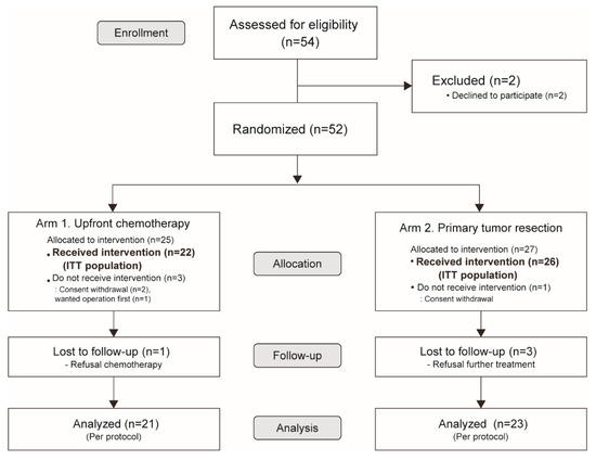This was an open-label, prospective, randomized controlled trial that took place in 12 tertiary hospitals in Korea. All patients were screened, then randomized in a 1:1 ratio into one of the two arms—Arm 1 (upfront chemotherapy alone) and Arm 2 (chemotherapy after PTR). Patients allocated into Arm 1 received chemotherapy without PTR within two weeks after randomization. Patients of Arm 2 received PTR within two weeks after randomization and then began to receive chemotherapy within two months after PTR. PTR was defined as the complete resection of the primary tumor (R0 resection) with negative resection margins and lymphadenectomy. The regimen of chemotherapy was determined by following the guidelines of the National Health Insurance Service of Korea. The expected accrual period was three years, and the follow-up period was two years in the initial study protocol. This study was performed following the Declaration of Helsinki and Good Clinical Practice guidelines, with each participating institution obtaining approval from their own institutional review board (No.3-2014-0127). The detailed study protocol was published and registered (ClinicalTrials.gov Identifier: NCT01978249) [28].