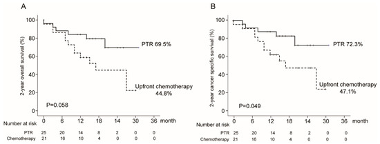 The two-year overall survival rate of the PTR group was not significantly higher than that of the upfront chemotherapy group, despite a drastic difference (69.5% in the PTR group and 44.8% in the upfront chemotherapy group, p = 0.058). However, the two-year cancer-specific survival rate of the PTR group was significantly higher than that of the upfront chemotherapy group (72.3% in the PTR group and 47.1% in the upfront chemotherapy group, p = 0.049) (Figure 2).