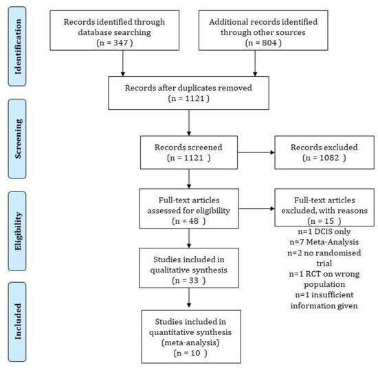 On 10 April 2020, we performed a literature review according to the published PRISMA guideline [21]. We searched the MEDLINE as well as the EMBASE and EBM review platforms. Further, we screened the major meetings for published abstracts. The chosen keywords were (“radiation therapy” or “radiotherapy” or “irradiation”) AND (“breast cancer” or “carcinoma of the breast”) AND (“partial” or “targeted”) AND (“randomized” OR “randomised” OR “randomly”).