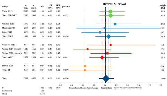 Figure 2 shows the analysis of OS between PBI and WBI, which was not statistically different between the groups (n = 14,070; HR = 1.02; CI-95%: 0.89–1.16; p = 0.810). There was no detectable heterogeneity (I2 = 0.00). We found no significant differences in the subgroup analysis by radiation technique.
