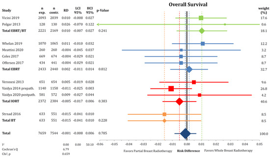 We obtained similar results regarding OS when analyzing risk differences, as depicted in Figure 3. The absolute difference in the proportion of patients dying between the groups was 0.1% (n = 15,203; RD = −0.001; CI-95%: −0.008–0.006; p = 0.785) without any noticeable heterogeneity (I2 = 0.00). In absolute terms, the percentages of patients alive in the trials were 93.17% with PBI and 93.40% with WBI in cumulative numbers at the last reported follow-up point using the raw data.