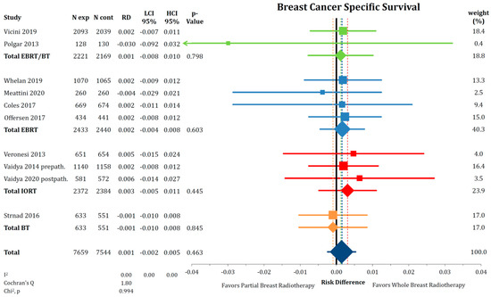 Comparison of breast cancer-specific survival by risk difference between partial- and whole breast radiation using a forest plot and the inverse variance heterogeneity model. Trials are grouped by radiation technique. Quadrats and diamonds represent individual trials and pooled effect sizes with corresponding 95% confidence intervals.
