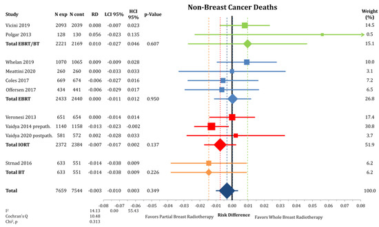 Breast cancer-specific survival was also not different between PBI and WBI with a risk difference of 0.1% (n = 15,203; RD = 0.001; CI-95%: −0.002–0.005; p = 0.463) without any detectable heterogeneity (I2 = 0.00) (Figure 4). The cumulative incidence of death from breast cancer was 2.0% after PBI and 1.9% after WBI. Additionally, mortality due to other causes than breast cancer (NBCD) was not different in the PBI group compared to WBI with a risk difference of 0.3% (n = 15,203; RD = −0.003; CI-95%: −0.010–0.003; p = 0.349) (Figure 5). The analysis revealed no heterogeneity between the trials (I2 = 14.13). Cumulatively, 4.8% in the PBI and 4.7% in the WBI arms of the included patients died from other causes than breast cancer.