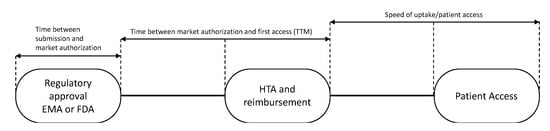 Access to health care has been defined as “the timely use of services according to needs” [9,10]. Novel drugs are faced with long procedures before patients will have access, not only in the developmental phase, but also in the regulatory processes, after finalization of the pivotal trials. The United States (US) and the European Union (EU) each have their own agencies that provide market authorization for new medicines, respectively the U.S. Food and Drug Administration (FDA) and the European Medicines Agency (EMA). Market authorization is based on the evaluation of safety, efficacy, and quality of the product. Both agencies have special fast track procedures and accelerated approval programs. Moreover, for drugs with high potential patient value, FDA can provide a priority review, that has a maximal review time of 6 months [11]. The accelerated access procedure of EMA should maximally take 150 days, i.e., 5 months [12].