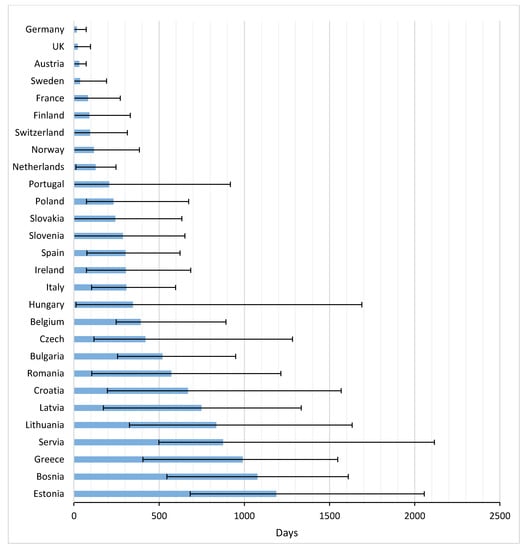 The average TTM in Europe amounted to 398 days (range 17–1187 days). In general, patients in Germany, the UK, and Austria had the most rapid potential access, with averages of 17, 22, and 31 days, respectively. Greece and many Eastern European countries were below the European average.