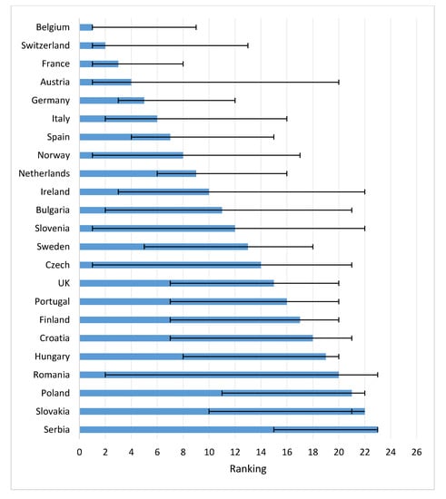 Figure 4. Speed of drug uptake for 12 newly registered oncological drugs in first two years across Europe (average rank, range) (Note: Too little access data for ranking: Lithuania, Greece, Bosnia, Estonia).