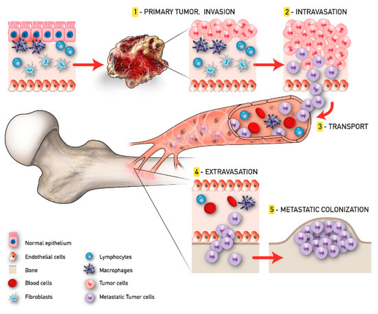 The development of malignant bone metastasis is recognized as a dynamic multistep process, in which a subpopulation of cancer cells from the primary tumor gain the capability to invade surrounding tissues, intravasate, survive in the bloodstream, and extravasate, giving rise to the metastatic colonization in a distant bone microenvironment [26]. Considering its complexity, a successful approach to study the intrinsic biology of bone metastasis is to separate the various steps of the cascade and to deeply characterize the bone metastatic microenvironment. Quiao and Tang extended the concept of “fertile soil“, proposed by Paget, to include three distinct microenvironments: the primary tumor microenvironment (PTM), the circulation microenvironment (CM), and the bone microenvironment (BM), each one distinguished by several key points that will be further discussed [27].