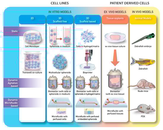 Cancer harbors variable heterogeneity and plasticity, which are both difficult features to reproduce in experimental models but essential for maintaining intra- and inter-patients’ differences and for accurately analyzing molecular mechanisms of the neoplastic transformation or for drug screening purposes. While substantial progress has been made in developing anti-cancer treatment strategies for primary tumors, such as breast and prostate cancer, the therapeutic interventions for metastatic cancer still present challenges. These challenges are primarily due to the tumor heterogeneity between and within individual patients, which results in significant differences in the tumor growth rate, invasive ability, drug sensitivity, and prognosis among individual patients [1]. For these reasons, there is a clear necessity to develop accurate cancer models to better investigate molecular mechanisms that lead to cancer onset/progression and to find more effective treatment strategies.