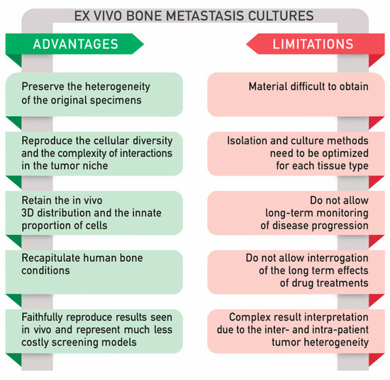 In general, the ex vivo culture setting allows maintaining the interactions within tumor cells and the microenvironment. Unfortunately, the cells survive only for a few days [140]. In particular, it is known that maintaining biopsies in culture preserving their viability and integrity is very complex. One of the main challenges is to maintain an adequate level of oxygen within the tissue explant. Fluctuations in its concentration result in modified cell features; on the other hand, oxygen variations are typical of each tissue. In particular, oxygen levels are very low in bone tissue in comparison to other sites. Moreover, commonly, in vitro culture conditions are maintained under a determinate amount of oxygen (usually around 21%) [141], which is not representative of most tissues and especially not for bone. Indeed, this is a limit in a long-term monitoring of disease progression and in drug treatments. Furthermore, patient-derived biopsies are often difficult to achieve, and the isolation and culture methods need to be optimized for each tissue type [110]. Complex methods can lead to difficult interpretation of the results, mainly due to the intrinsic heterogeneity of the samples. [142]. The main advantages and limitations of the ex vivo models are reported in Figure 3.