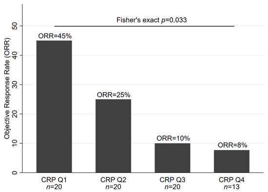 Seventy-three patients (81%) had a baseline CRP measurement and their radiographic response evaluated. Among this population, patients with higher CRP levels at baseline featured significantly lower odds of objective response to ICI therapy (odds ratio (OR) of objective response per doubling of baseline CRP = 0.68, 95% CI: 0.51–0.92, p = 0.013). In detail, ORR estimates were 45% (95% CI: 23–68), 25% (9–49), 10% (1–32) and 8% (0–36) in patients with a baseline CRP within the first (CRP ≤ 7.7 mg/L), second (CRP > 7.7 mg/L but ≤21.6 mg/L), third (CRP > 21.6 mg/L, but ≤66.1 mg/L) and fourth (CRP > 66.1 mg/L) quartile of the baseline CRP distribution, respectively (Fisher’s exact p = 0.033, Figure 1). Among all covariables, only lower age emerged as a statistically significant univariable predictor of worse ORR (Table 2). The association between elevated baseline CRP and lower odds of response prevailed in multivariable analysis adjusting for age (adjusted OR per doubling of baseline CRP = 0.66, 95% CI: 0.47–0.91, p = 0.011), as well as in analyses adjusting for LDH, NLR or the LIPI score (Table S3).