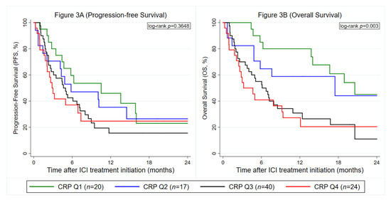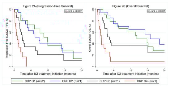 Prognostic association between baseline CRP levels and immune checkpoint inhibitors (ICI) treatment outcomes in the Graz cohort (n = 85). (A) Progression-Free Survival. (B) Overall Survival. Data are only for patients with observed baseline CRP. Curves were estimated with Kaplan–Meier estimators. The left panel (Figure 2A) depicts a PFS analysis and the right panel (Figure 2B) an OS analysis, respectively. CRP cutoffs were as follows: Q1: CRP ≤ 7.7 mg/L, Q2: CRP > 7.7 mg/L, but ≤21.6 mg/L, Q3: CRP > 21.6 mg/L, but ≤66.1 mg/L and Q4: CRP > 66.1 mg/L. Abbreviations: PFS—progression-free survival; OS—overall survival; CRP—C-reactive protein; Q—quartile; ICI—immune checkpoint inhibitor.