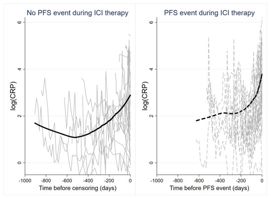 Line plot of CRP trajectories in patients who did (right panel, gray dashed lines) and did not (left panel, gray solid lines) develop a PFS event during ICI therapy. Each line represents the log(CRP) trajectory of a single patient. The bold solid line (left panel) and bold dashed line (right panel) represent moving averages (locally weighted sum-of-squares (LOWESS) nonparametric smoother). Note that the time on the x-axis of both panels is inverted, i.e., it represents the time before a PFS event or censoring without a PFS event. Abbreviations: PFS—progression-free survival; ICI—immune checkpoint inhibitor.