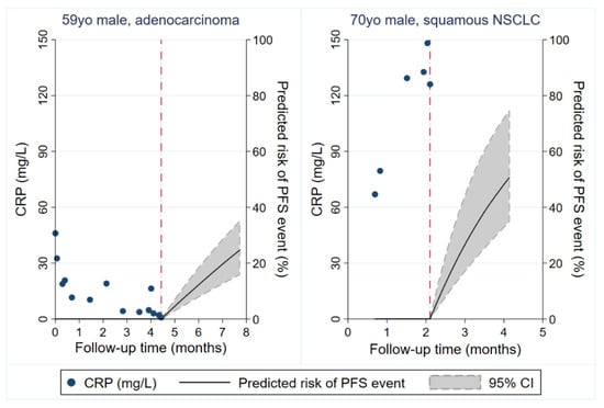 Personalized prediction of ICI therapy PFS outcomes based on individual patients longitudinal CRP trajectories. Predictions were obtained from a joint model of longitudinal and time-to-event data. Figure depicts predictions of 3-month risks of developing a PFS event for two study patients. The left panel depicts a 59-year-old male with synchronously metastasized adenocarcinoma (including brain metastases) and significant comorbidity who had decreasing CRP levels during 1st-line therapy with pembrolizumab. His predicted risk of a PFS event 3 months after his last study visit is 25%. Computed tomography staging examinations one week after his last study visit revealed stable disease, and the patient continued ICI therapy. The right panel depicts a 70-year-old male in limited performance status (ECOG 2) with synchronously metastasized squamous NSCLC and steadily increasing CRP levels during 1st-line therapy with pembrolizumab. His predicted risk of a PFS event 3 months after his last study visit is above 50%. The patient was referred to mobile palliative care services shortly after the last study visit due to symptomatic pleural effusion and radiographically documented progressive disease. Red dash-dotted line: Last study visit. Abbreviations: yo—year-old; NSCLC—non-small cell lung cancer; CRP—C-reactive protein; PFS—progression-free survival.