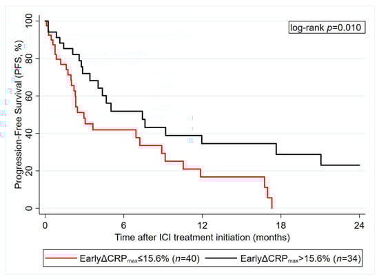 Exploratory, hypothesis-generating analysis of “early CRP decline” as a predictor of ICI therapy PFS outcome in the Graz cohort (n = 74). Data are from patients with observed baseline CRP and available 8-week CRP data. Early CRP decline was defined as the maximum percent decline in CRP during the first 8 weeks after ICI treatment initiation, with patients with CRP increase set to 0. A cutoff at 15.6% was derived using Youden’s Index. Abbreviations: PFS—progression-free survival; ICI—immune checkpoint inhibitor; CRP—C-reactive protein; EarlyΔCRPmax—early relative decline in CRP.