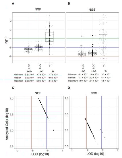 Key metrics of multicolor flow cytometry (MFC) and next-generation sequencing (NGS) analyses. The tumor load (TL) with the corresponding limit of detection (LOD) and limit of quantification (LOQ) is shown for each sample analyzed with (A) MFC and (B) NGS. The horizontal lines represent different possible minimal residual disease (MRD) cut-offs (1 × 10−4 green, 1 × 10−5 blue and 1 × 10−6 red). Descriptive statistics (minimum, median, maximum) for each key metric are shown below the figure. The number of analyzed cells and the corresponding LODs are shown for each sample on a log10 scale for (C) MFC and (D) NGS analysis. The vertical lines represent different possible MRD cut-offs (1 × 10−5 blue and 1 × 10−6 red).