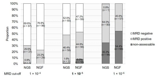 The effect of assigning different MRD cut-offs can impressively be demonstrated by the assignment of the MRD status (positive vs. negative vs. nonassessable) based on the sample TL and LOD at the consensus MRD cut-offs (Figure 2). Stepwise decreasing of the MRD cut-off from 1 × 10−4 to 1 × 10−6 resulted in a decrease in MRD-negative cases from 69.6% (n = 87) to 0.8% (n = 1) in the NGS analysis and from 76.8% (n = 96) to 0.0% (n = 0) in the MFC analysis. However, the number of nonassessable cases due to missed LOD increased by 34.4% in the NGS analysis (from 0.8%, n = 1 to 35.2%, n = 44) and by 54.4% (from 0.0%, n = 0 to 54.4%, n = 68) in the MFC analysis. Based on the median LOD and percentage of nonassessable cases, 1 × 10−5 was chosen as the best-fit MRD cut-off for further analysis in the current study (median LOD 1.7 × 10−6 in NGS and 6.0 × 10−6 in MFC; nonassessable cases 1.6%, n = 2 in NGS and 8.0%, n = 10 in MFC).