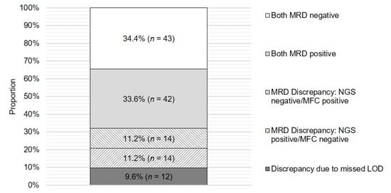 At an MRD cut-off of 1 × 10−5, concordant MRD-positive results were found in 33.6% (n = 42) of cases, and concordant MRD-negative results were found in 34.4% (n = 43), resulting in an overall concordance proportion of 68.0% (n = 85). Discordant results—NGS MRD positivity/MFC MRD negativity and vice versa—were found in 11.2% (n = 14) of patients in each direction, resulting in an overall discordance rate of 22.4% (n = 28). Discordancy due to undercut LOD by either of the two methods was estimated to be 9.6% (n = 12; Figure 3). Excluding discordant results caused by undercut LOD by either of the methods, Cohen’s kappa coefficient (κ) for interrater agreement between the MRD status of the two methods was 0.536 (n = 113, p < 0.001).