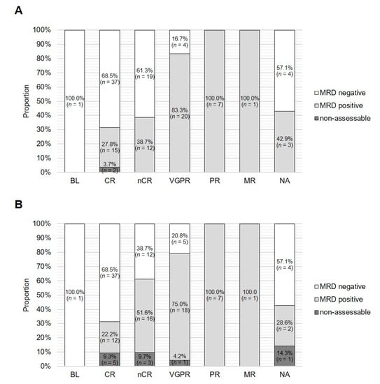MRD status assessed by NGS and MFC according to serological response. The proportion of MRD-positive, negative and nonassessable cases at the MRD cut-off of 1 × 10−5 is shown according to the serological remission status for (A) NGS and (B) NGF. BL, baseline; CR, complete remission; NA, not available; nCR, near complete remission; PR, partial remission; VGPR, very good partial remission.