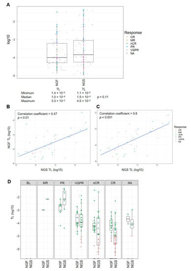 Tumor load in MRD-positive cases. The figure shows the tumor loads (TLs) of NGS/NGF MRD-positive cases at an MRD cut-off of 1 × 10−5. The results are presented (A) cumulatively for all these cases and (D) according to serological response; all comparison p-values > 0.05; green, MRD-positive; red, MRD-negative; blue, MRD-nonassessable due to a missed LOD. The correlation between the TLs of the MRD-positive pairs assessed by NGS and MFC is shown for (B) all pairs and (C) after removal of two extreme outliers. BL, baseline; CR, complete remission; MR, minimal response; NA, not available; nCR, near complete remission; PR, partial remission; TL, tumor load; VGPR, very good partial remission.