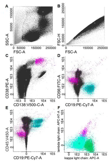 Gating strategy for the identification of aberrant plasma cells. After exclusion of debris (gray, A) and duplets (gray, B), plasma cells are defined as the CD38- and CD138-positive population (purple, C) among the leukocytes (black). Aberrant plasma cells are usually CD56-positive, CD19-low and CD45-low (D,E). Moreover, aberrant plasma cells show light chain restriction (in this case, lambda, F). Non-aberrant plasma cells do not display a light chain restriction, similar to B-cells (green) that display a regular distribution with regard to the kappa and lambda light chains (F). Gating was performed with Infinicyt Flow Cytometry Software. SSC-A, side scatter area; FSC-A, forward scatter area; FSC-H, forward scatter height.