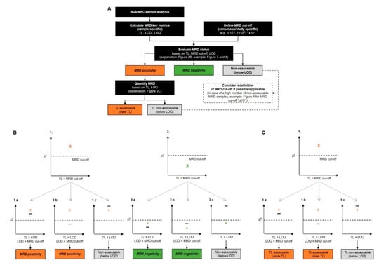 TL, LOD, usually called the sensitivity level, a prerequisite for the “MRD-positive” vs. “MRD-negative” vs. “nonassessable” decision, and LOQ, the basis for the numerical quantification of the tumor load, were calculated as sample-specific MRD key metrics individually for the NGS and MFC analyses.