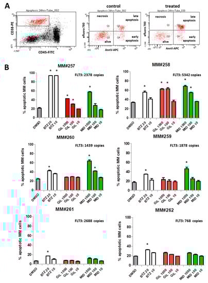 2.5. FLT3 Inhibitors Block Proliferation of MM Cell Lines and Induce Apoptosis of Primary MM Cells