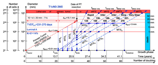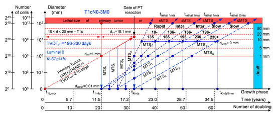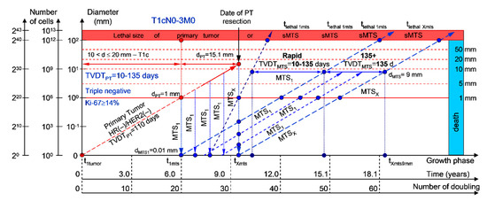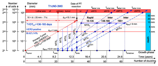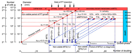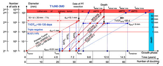 The appearance of the first metastatic cell of the first sdMTS coincides with the 20th doubling of the PT of BC, which allows defining the non-visible growth period of the sdMTS and the initial period of sdMTS manifestation [7,14,15,21,55,56]. The appearance of the last metastatic cell of sdMTS coincides with the date of BC PT resection [21].