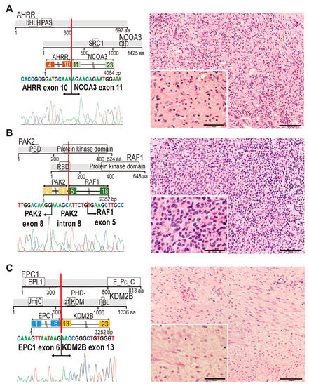 Diagrammatic representation of three novel fusion genes (part 1). (A–C) Left: proteins involved in individual fusions, fusion transcripts and the junction sequences validated in the RT-PCR experiments. Right: representative morphologic findings. Scale bars: 100 µm (right) and 50 µm (inset). (A) AHRR-NCOA3 in case #43. bHLH: basic helix-loop-helix domain; PAS: PAS domain involved in protein dimerization; SRC1: Steroid receptor coactivator 1 domain; CID: CREB-interacting domain. Spindle cell sarcoma with relatively low cellularity and inflammatory cell infiltration (right). (B) PAK2-RAF1 in case #2. PBD: p21-Rho-binding domain; RBD: Ras-binding domain. Sarcoma shows round cell morphology with nuclear polymorphism (right). (C) EPC1-KDM2B in case #55. EPL1: enhancer of polycomb-like 1; E_Pc_C: enhancer of polycomb C-terminus; JmjC: jumonji C; ZF: zinc finger; PHD-KDM: PHD finger in lysine-specific demethylase; FBL: F-box-like. Low-grade spindle cell sarcoma with fibromyxoid stroma (right).