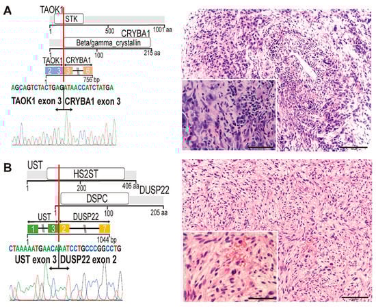 Diagrammatic representation of two novel fusion genes (part 2). (A,B) Left: proteins involved in individual fusions, fusion transcripts, and the junction sequences validated in the RT-PCR experiments. Right: representative morphologic findings. Scale bars: 100 µm (right) and 50 µm (inset). (A) TAOK1-CRYBA1 in case #14. STK: serine/threonine kinase. Highly aggressive round cell sarcoma with extensive nuclear polymorphism (right). (B) UST-DUSP22 in case #50. HS2ST: heparan sulfate 2-O-sulfotransferase; DSPC: dual-specificity phosphatase catalytic domain. Spindle cell sarcoma with atypical mitosis (right).