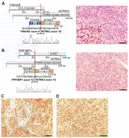 The present study identified four cases of NTRK fusions consisting of TPR-NTRK1 in two cases, YWHAE-NTRK3 and PPFIBP1-NTRK3. YWHAE encodes a protein of the 14-3-3 family, and has been found fused to FAM22, or NUTM2A/B/E, in endometrial stromal sarcoma [33,34] and clear cell sarcoma of the kidney [35]. PPFIBP1 has been found fused to ALK in pulmonary inflammatory myofibroblastic tumors [36]. In both NTRK3 fusions herein, the protein kinase domain was preserved in the fusion proteins (Figure 4A,B), and the transforming capacity of PPFIBP1-ALK suggests that these NTRK3 fusions upregulate signaling downstream of NTRK3. Morphological analysis of the cases with the YWHAE-NTRK3 or PPFIBP1-NTRK3 fusions showed proliferation of short spindle tumor cells with occasional storiform pattern (Figure 4A,B). Diffuse expression patterns of tumor cells with the anti-CD34 and anti-pan-TRK antibodies were observed in the YWHAE-NTRK3 case by immunostaining (Figure 4C,D). These histological and immunohistochemical findings are consistent with those previously observed for NTRK-rearranged spindle cell neoplasm [1,19].